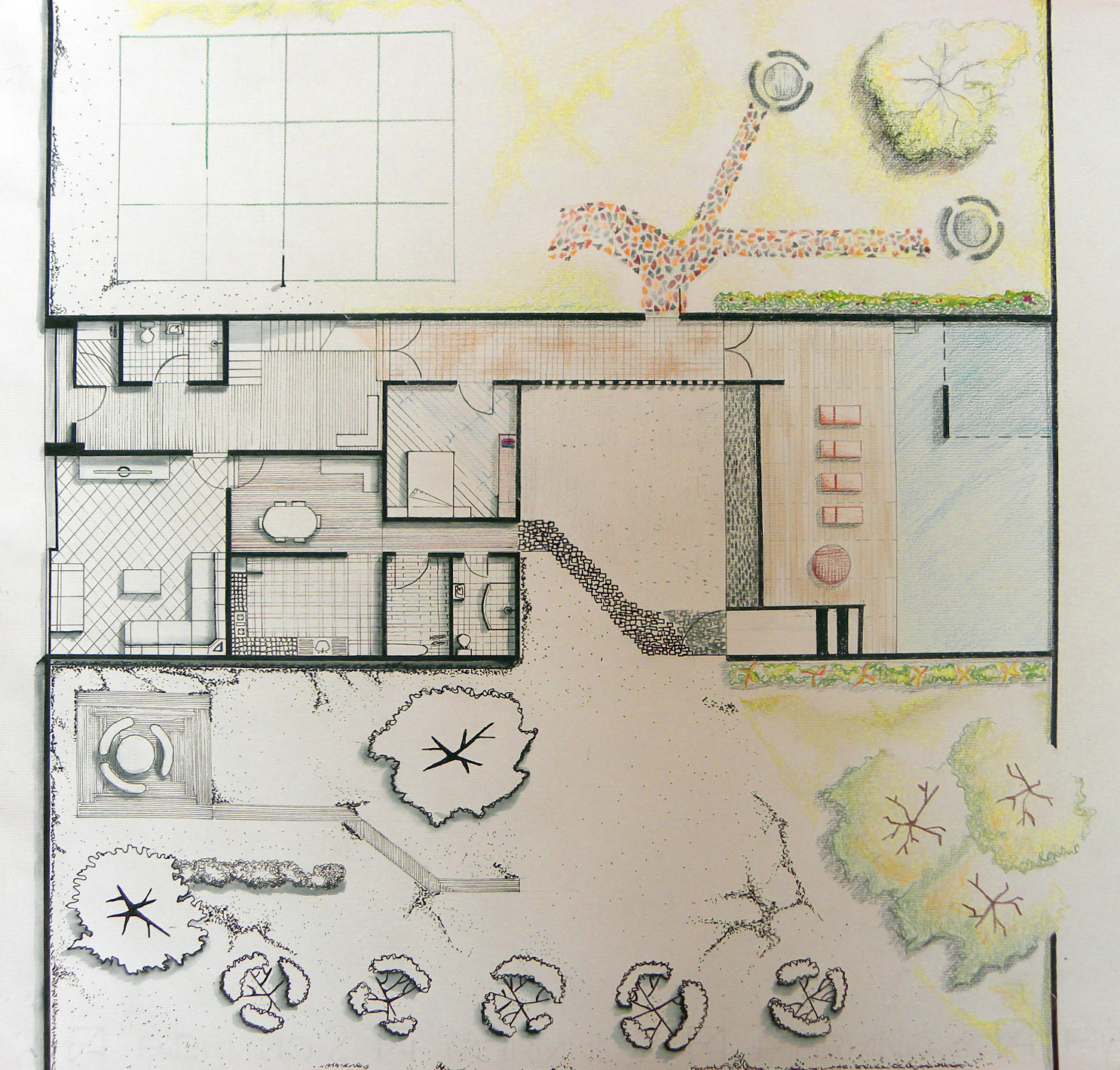 El dibujo tiene como finalidad acompañar a la arquitectura, dar un ambiente según el tipo de usuario. * texturas en acabados, * vegetación y árboles, * mobiliario * coches, y. Conocer los diferentes elementos que influyen en la ambientación.