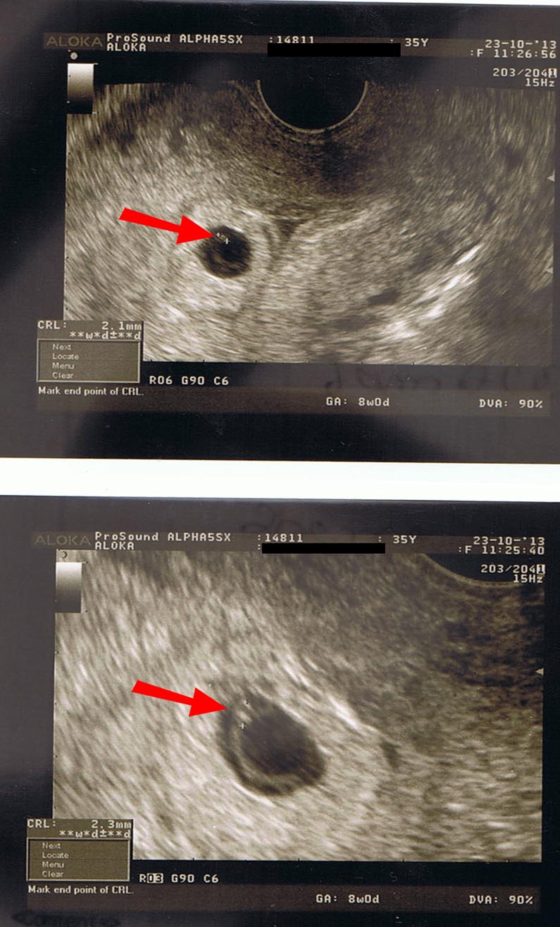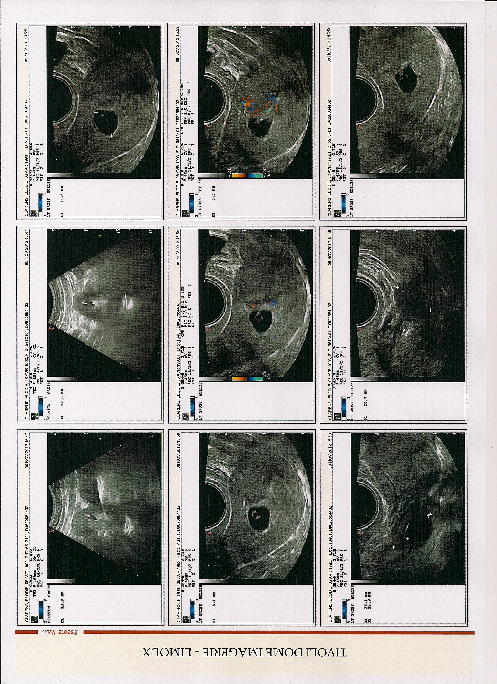 Pour les oeufs clairs (grossesse non évolutive) l'expulsion se fait généralement naturellement (règles presques normales), on controle parfois par une échographie que l'utérus est bien vide et si ce n'est pas le cas on peut procéder à un curetage. La gynéco confirme mes doutes, elle me dit que l’embryon a 1 mois de retard par rapport au terme calculé depuis mes dernières règles. Mon sac gestationnel est 14 mm et l'embryon serait de 2 mm.