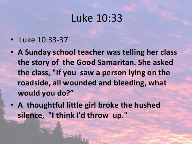 Thursday, July 11, 19 Following the story of the Good Samaritan: "Now which of these three would you say was a neighbor to the man who was attacked by bandits?" Jesus asked. 36 Which now of these three, thinkest thou, was neighbour unto him that fell among the thieves?. Then said Jesus unto him, Go, and do thou likewise.